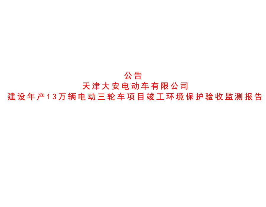 公司動(dòng)態(tài) 天津大安電動(dòng)車有限公司建設(shè)年產(chǎn)13萬輛電動(dòng)三輪車項(xiàng)目竣工環(huán)境保護(hù)驗(yàn)收監(jiān)測(cè)報(bào)告